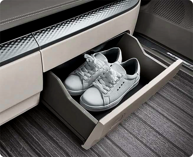 기존 판매 중인 모델(7인승,9인승)과 비교하여 2열의 승차감을 향상시키고, 후석 리무진시트 와 7인치 터치식 통합 컨트롤러 그리고 뒷좌석 스마트폰 무선 충전 시스템, 냉온장고등의 편의 기능, 후석 수납함도 추가한 것이 가장 큰 특징입니다.