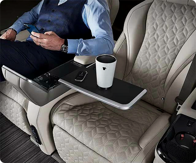 먼저 착좌감이 매우 좋은 최고급 시트폼과 입체적인 퀼팅 나파 가죽을 적용하여 디자인과 승차감을 모두 잡은 것이 특징입니다. 여기에 엉덩이와 허리의 하중 분산 및 편안한 휴식을 도와주는 '프리미엄 릴렉션 시트' 기능과 후석 전용 테이블도 추가하였습니다. 후석 전용 테이블에는 후석 시트 콘솔 내부에 좌,우 독립적으로 사용이 가능하여 마치 항공기 일등석과 같은 안락함과 편의성을 동시에 제공해주고 있습니다.